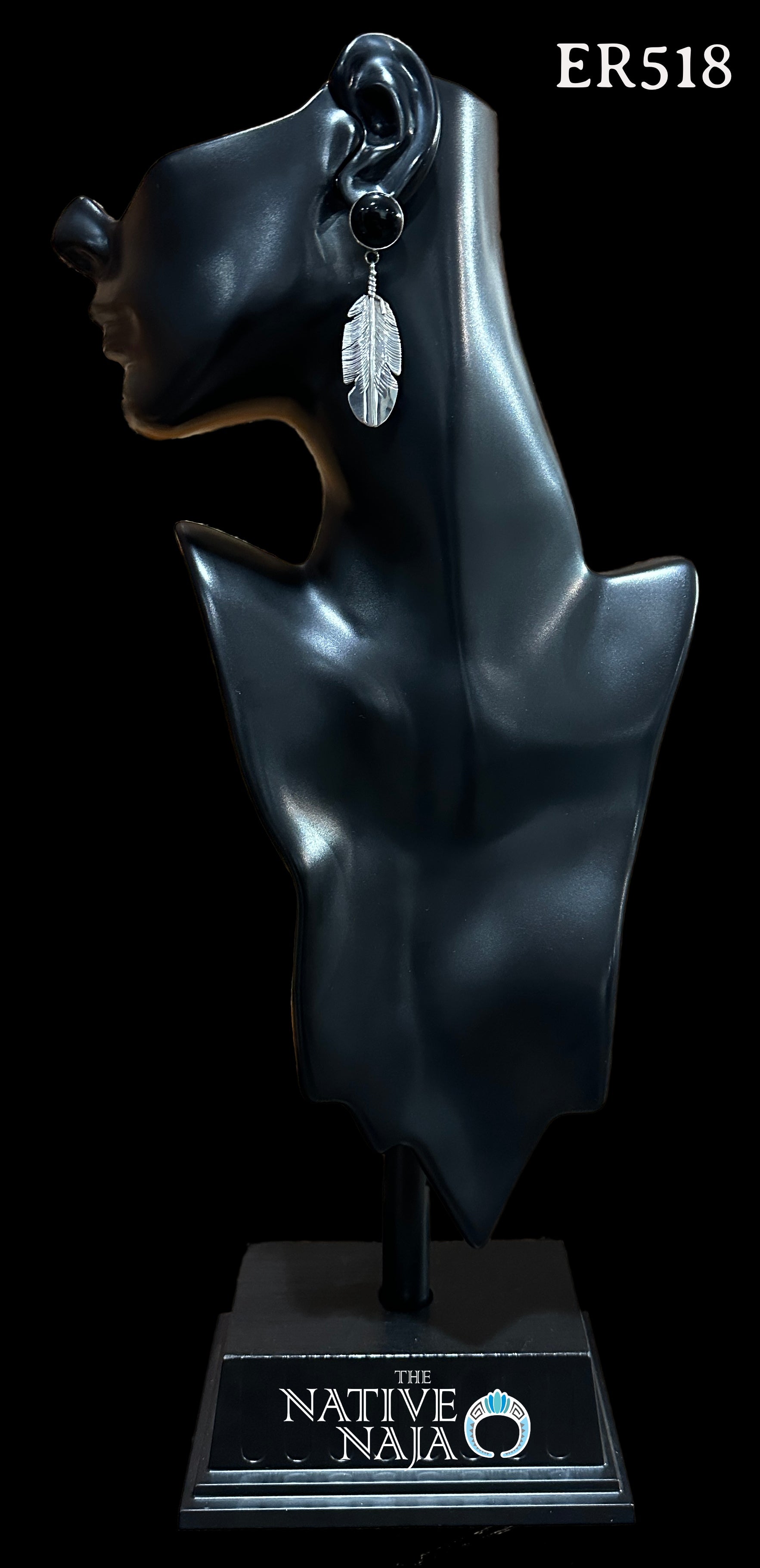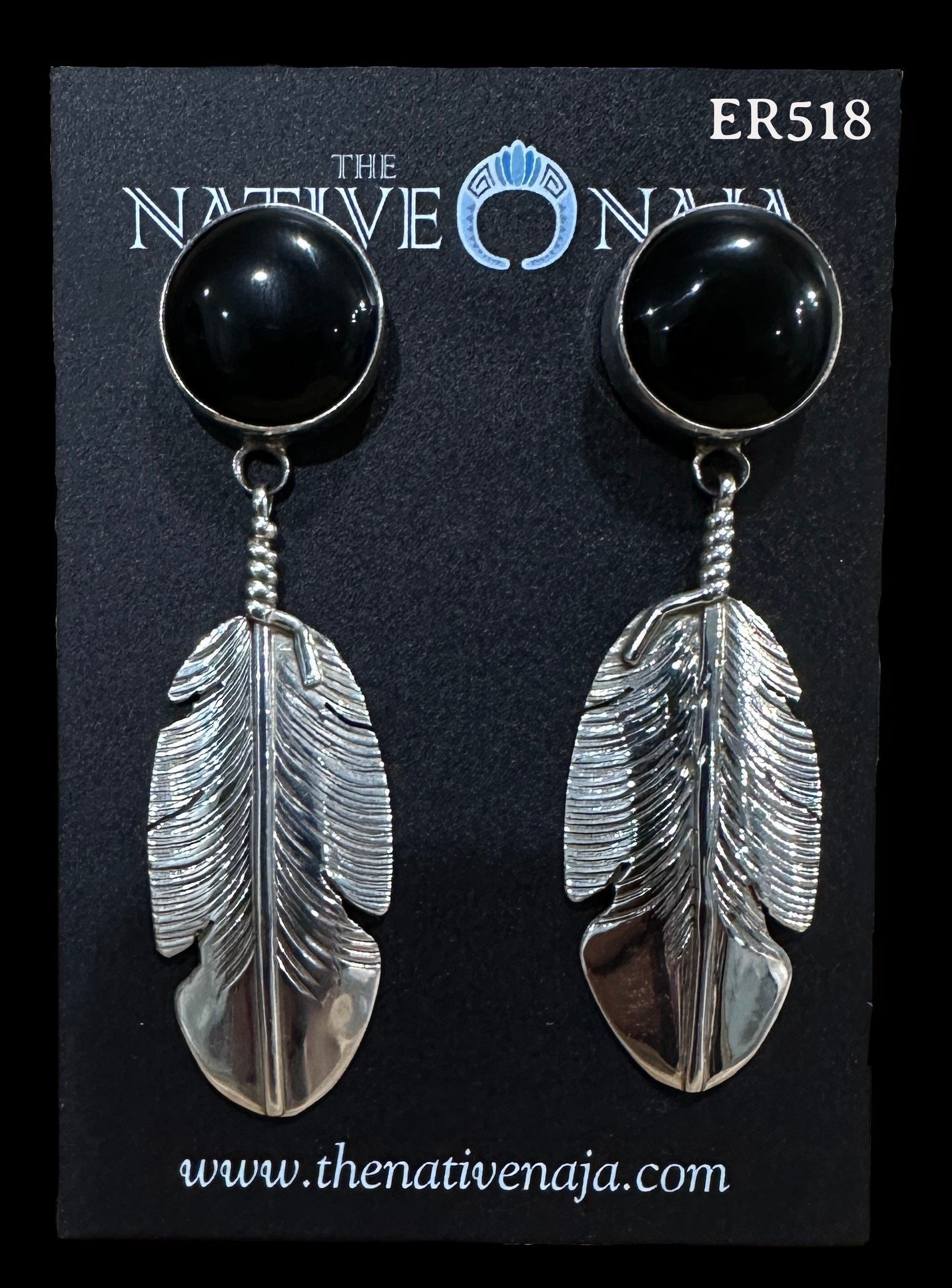 Large Navajo Ben Begay Black Onyx & Sterling Silver Feather Post Earrings ER518