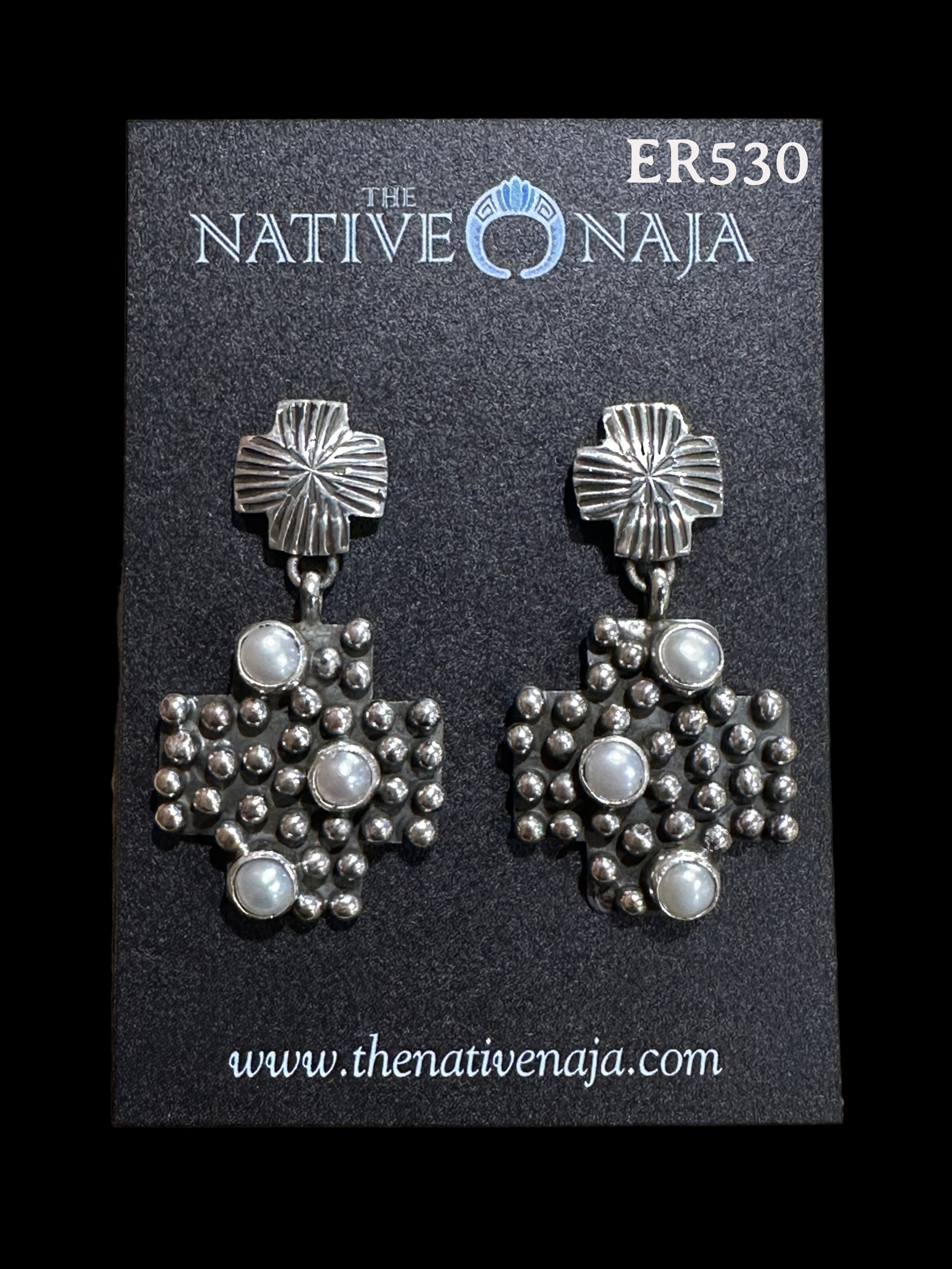 Navajo Geneva Apachito Freshwater Pearls & Sterling Silver Cross and Dot Cross Post Earrings ER530